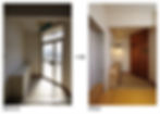 After写真の左手は元院長室へのドアがありましたが、現在は和室(ゲストルーム)の出入り口となっています。和室の天井高さを抑える(天井高さ2.2m)為に床を40cm程度上げており、この入り口の手前に踏み石の代わりに木塊を置いて2段上がるようにしています。その結果、ここの鴨居は丁度 頭を打つ高さとなり(笑)、躙口的に少し頭を下げながら出入りしなければなりませんがそこはご愛嬌。襖紙はfarrow-ball社製のカモメ柄ペイントクロスを貼っています。